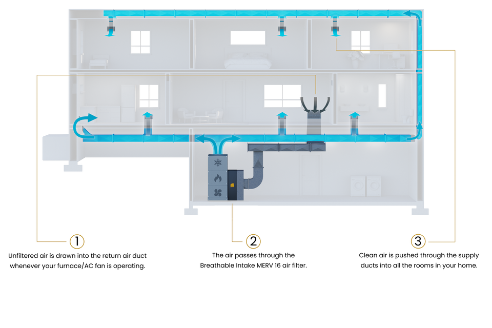 The Breathable Intake central air filtration system is integrated into your home’s heating and/or air-conditioning system. Once the system is installed, the air distributed throughout your home via the air ducts is thoroughly filtered on an ongoing basis.